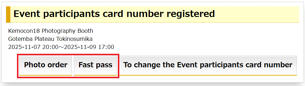 - Please click on the "My Page" button When the "Registration of the Event participants card number" is displayed.