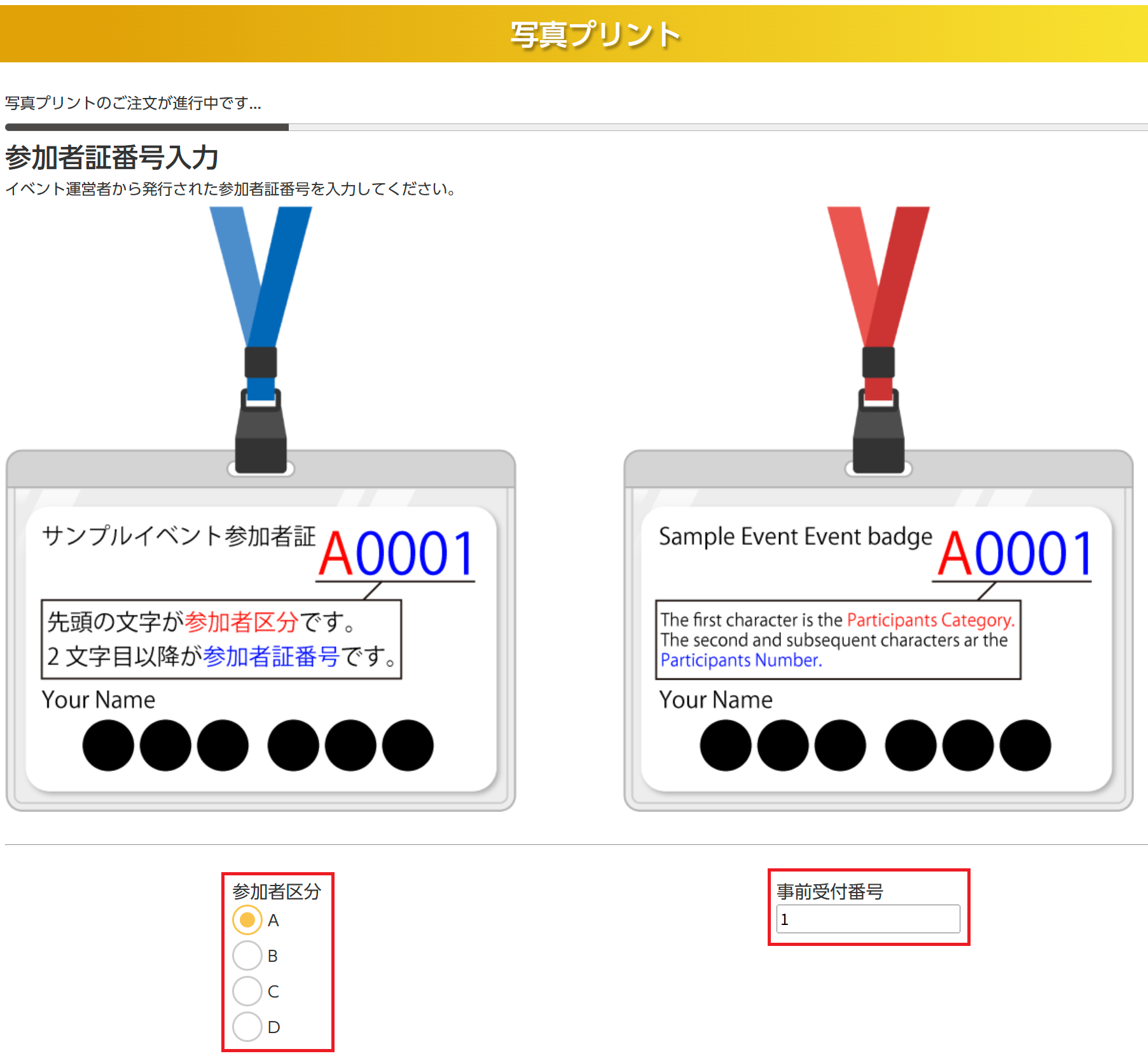 - イベント主催者から配布された参加者証または事前受付番号をご入力ください。